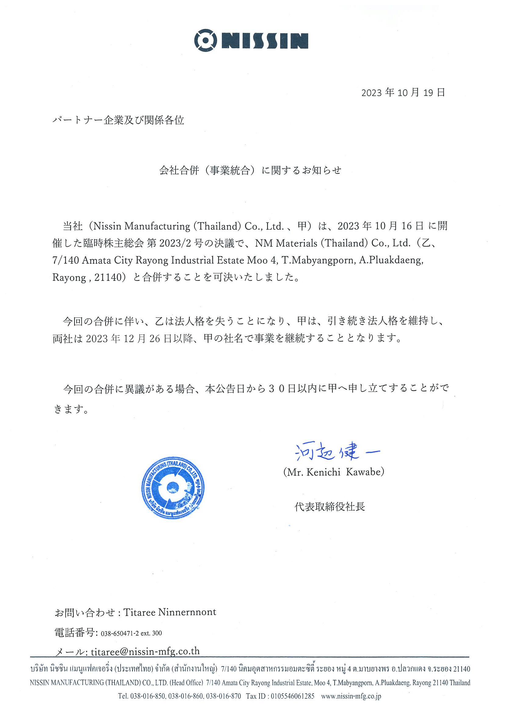 แจ้งประกาศเกี่ยวกับการควบรวมบริษัท(TH)